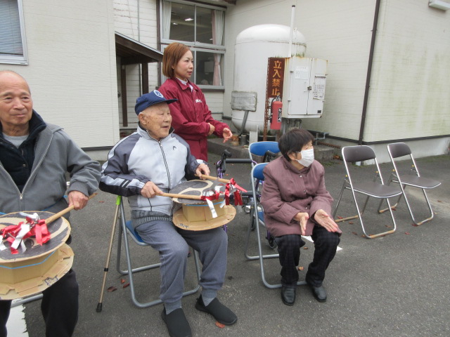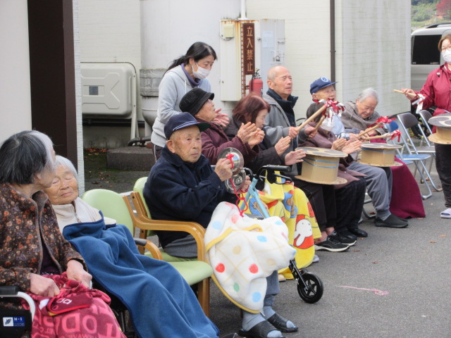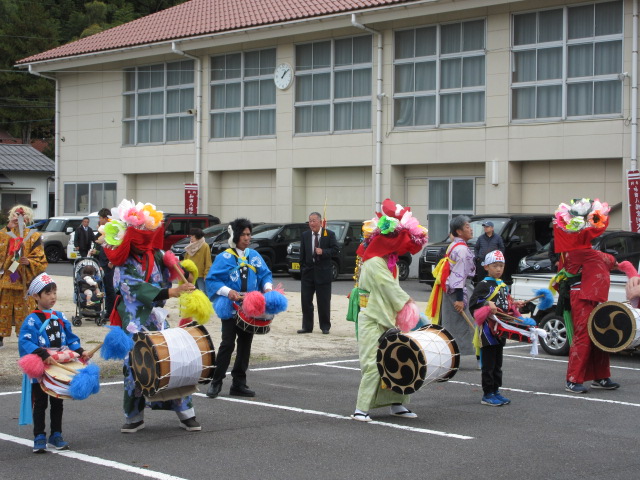 地域の皆さんがブナの木の前の校庭で楽うちをしてくださいました。